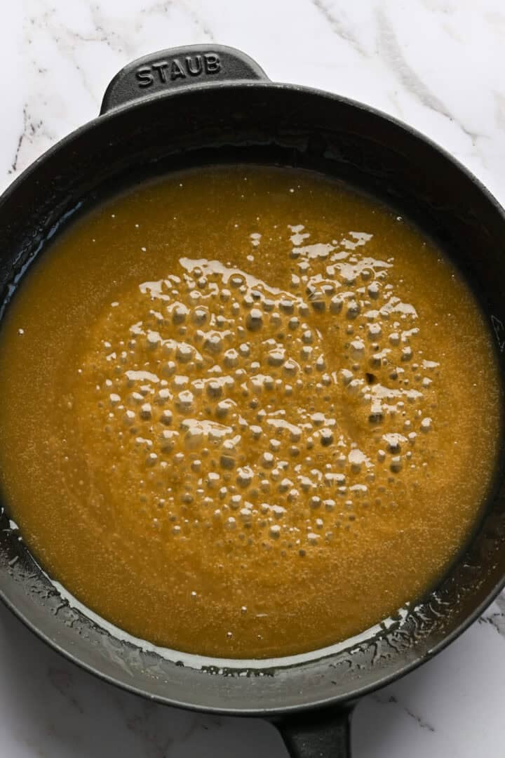 - Add butter to another pan over medium low heat. Once melted, add in the brown sugar and stir continuously, until the brown sugar is dissolved. Pour in the heavy cream and stir until the sauce starts to thicken.ย