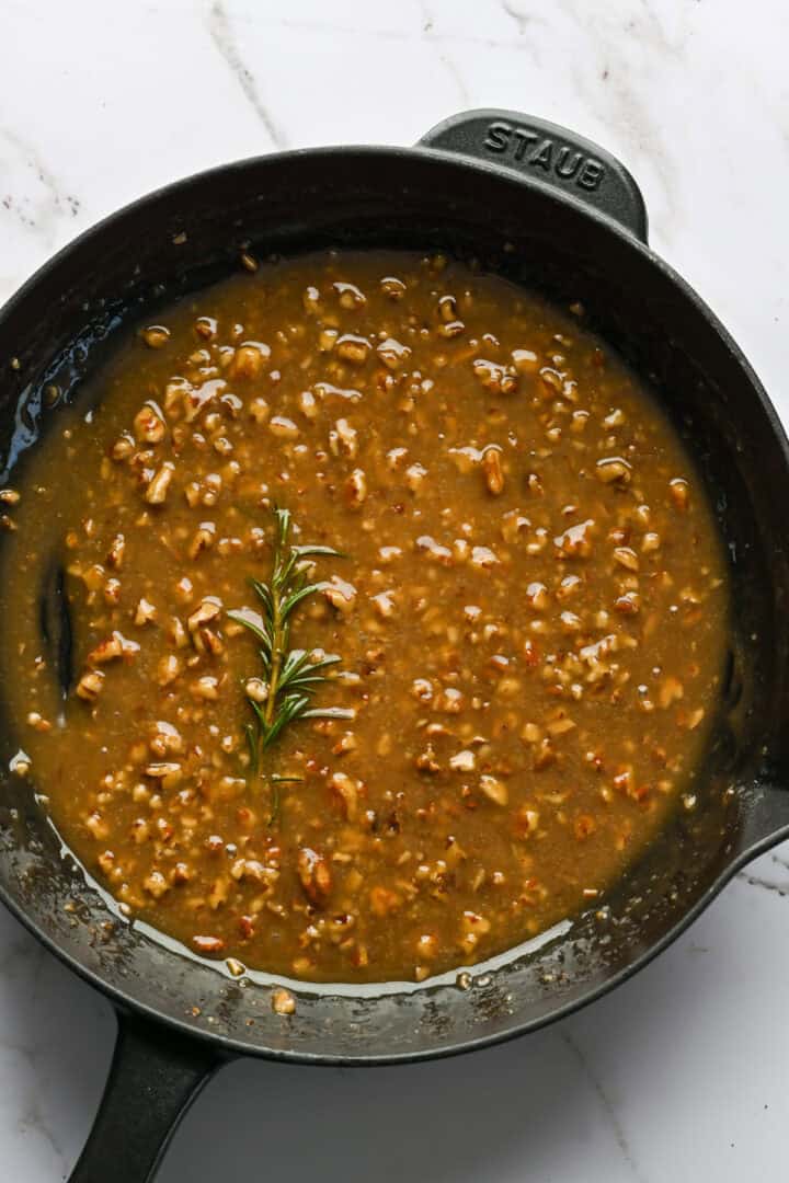 - Add in the pecans, rosemary, and a pinch of salt, and cook until the mixture thickens slightly, but still runs off a spatula easily (about 3 minutes). Remove from heat, then add in the bourbon carefully (it will bubble aggressively as the alcohol boils off). Stir well.ย