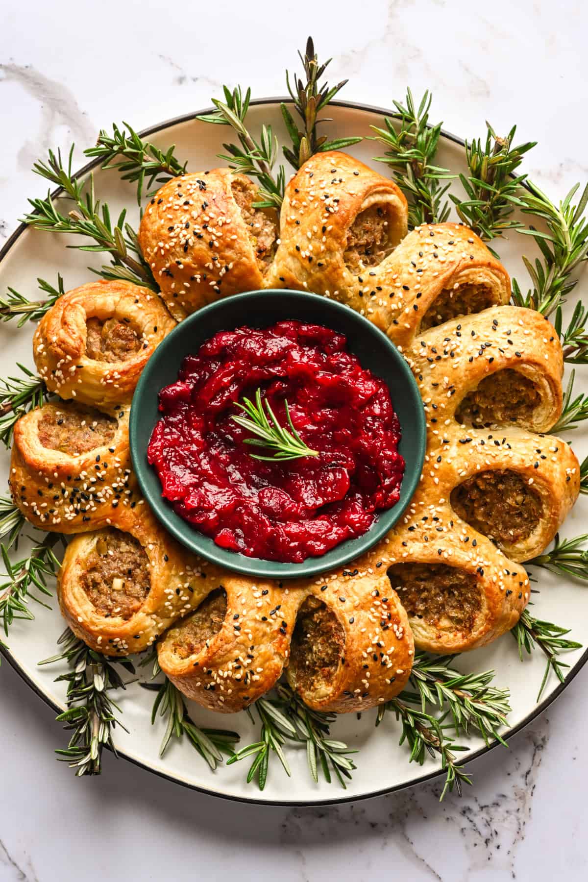 This savory Sausage Roll Wreath with cranberry sauce is the perfect pull-apart Christmas appetizer! Flaky, buttery puff pastry encases a flavorful thyme, fennel & sage seasoned sausage mixture, with a layer of Dijon mustard for an extra punch of flavor. This is such a show-stopping recipe that's surprisingly easy to make!ย