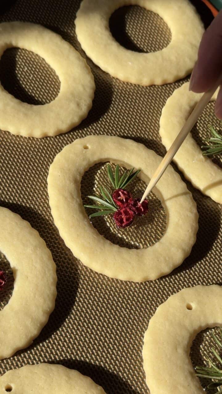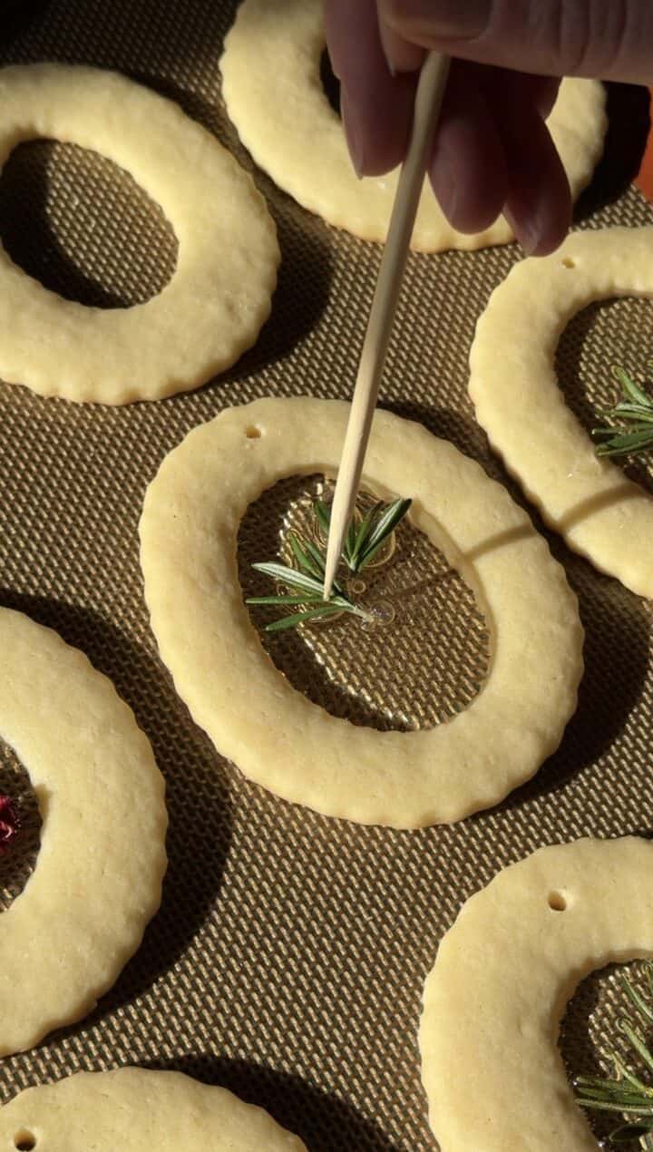 - Remove from the oven, let cool for 2 minutes, then transfer to a cooling rack to cool completely. If you're making ornaments, reinforce the hole by with a skewer right after they come out of the oven. Once cooled, transfer the cookies to a silicone baking mat over a heat proof cutting board. Prepare several small sprigs of rosemary (you'll need two per cookie) and 3 dried cranberries, pink peppercorns or round sprinkles for each cookie.